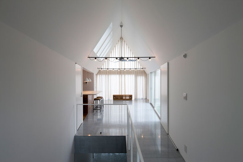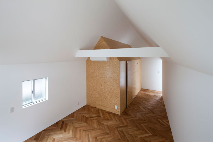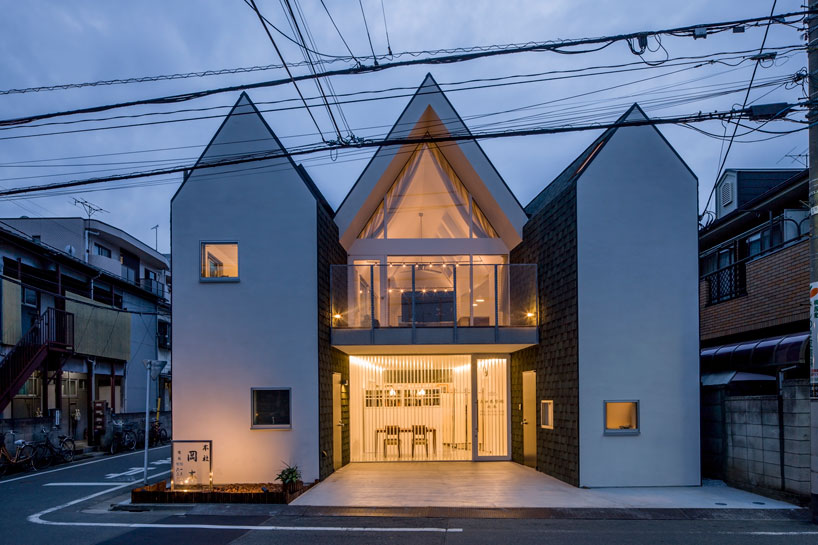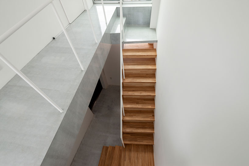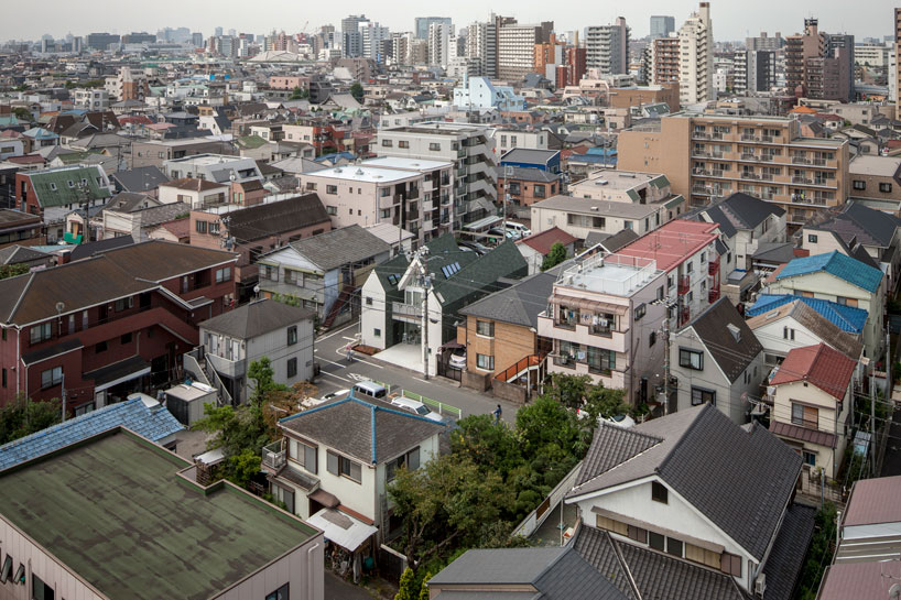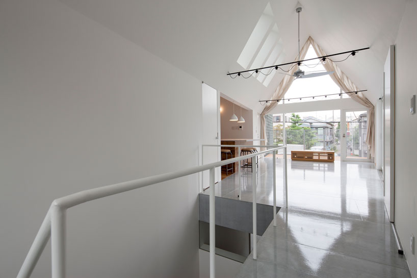 項(xiàng)目位于東京一處不規(guī)則的住宅區(qū)內(nèi),starpilots事務(wù)所設(shè)計(jì)的這處“housecut”,是一棟帶有他們個(gè)人辦公空間的家庭住宅。地塊位于街角的位置,不規(guī)則的形式拆分成了三個(gè)高大的結(jié)構(gòu),其中中間的體塊與兩側(cè)相比后退了一部分,形成了一處受庇護(hù)的門(mén)廊。將這棟建筑拆分成三個(gè)體塊是因?yàn)樵摰貕K正處于城市道路建設(shè)規(guī)劃之中。因此,如果該規(guī)劃通過(guò),其中一個(gè)體塊就會(huì)被拆掉。這三個(gè)體塊每個(gè)都有自己獨(dú)立的入口,同時(shí)結(jié)合整體規(guī)劃,該住宅也提供了該家庭殯葬公司的空間。