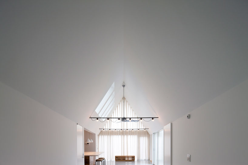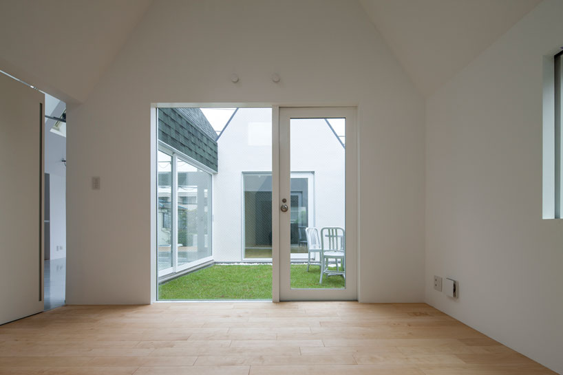 在建筑后部,坡屋頂體量長(zhǎng)度不一,結(jié)合隨機(jī)布置的窗洞,可以獲得不同角度的照明。從外部看,建筑的每個(gè)面都覆蓋著綠色的屋面瓦,同時(shí)左側(cè)立面都是白色的。這棟與眾不同的住宅在頂層有一處室外庭院,與周?chē)觽鹘y(tǒng)的住宅相比,它從結(jié)構(gòu)上和形象上都要顯得有趣。