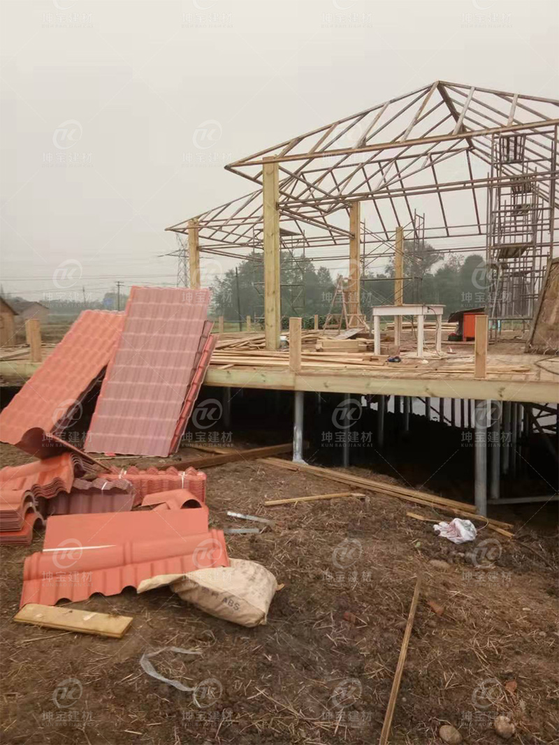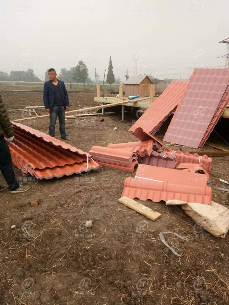 大邑度假村項目的接待室采購合成樹脂瓦用作屋面瓦,采購商是大邑潤地農業(yè)有限公司,采購清單300米,橘橙色,3.0MM厚樹脂瓦,屋面整體采用的是防腐木做支撐。