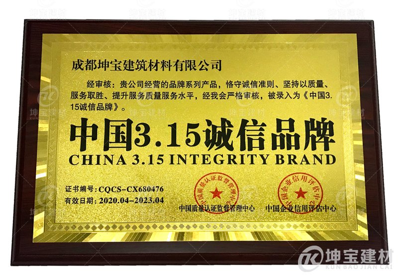 由中國質量認證監督管理中心舉辦,通過對千余家企業的誠信、質量情況進行明察暗訪, 并結合企業信用評估中心,由專家組嚴格審核后,坤寶樹脂瓦以優異表現榮獲由中國質量認證監督管理中心,中國企業信用評估中心頒發的“中國315誠信品牌”,得到公會和業內專家的一致認可。坤寶樹脂瓦憑借可靠的企業信用,過硬的產品質量,和優質的售后 服務,順利通過考核,獲此殊榮。