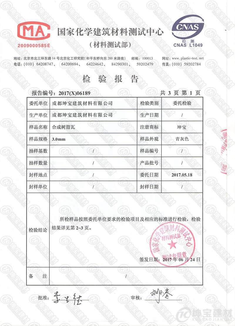 成都坤寶建筑材料有限公司是一家集生產、銷售、安裝于一體的合成樹脂瓦廠家,公司先后從國內外引進11條生產設備,采用ASA樹脂和優質PVC樹脂為原料、經過嚴格的科學配比、9年專業生產技術和經驗、采用三層共擠技術,生產而成的坤寶牌合成樹脂瓦產品、品質有保證!我們采用線上線下相結合的銷售模式,廠家批發直銷,可定制生產,產品價格合理,售后服務完善。