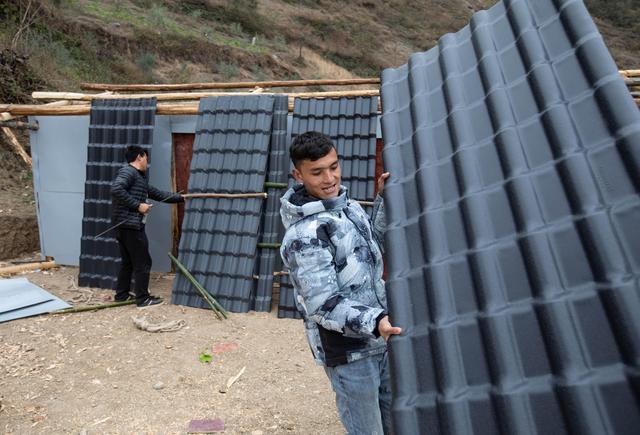 12月23日,某色蘇不惹(左)在捆綁固定合成樹脂瓦,準(zhǔn)備通過鋼梯背到村里。