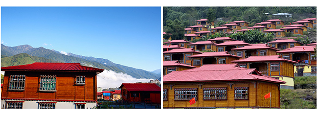 合成樹脂瓦在西藏適用面廣泛:農村自建別墅屋面、平改坡、舊房翻新、新農村建設、樓頂花園、小區、窯洞屋頂改造、亭臺樓榭、城區改造等。