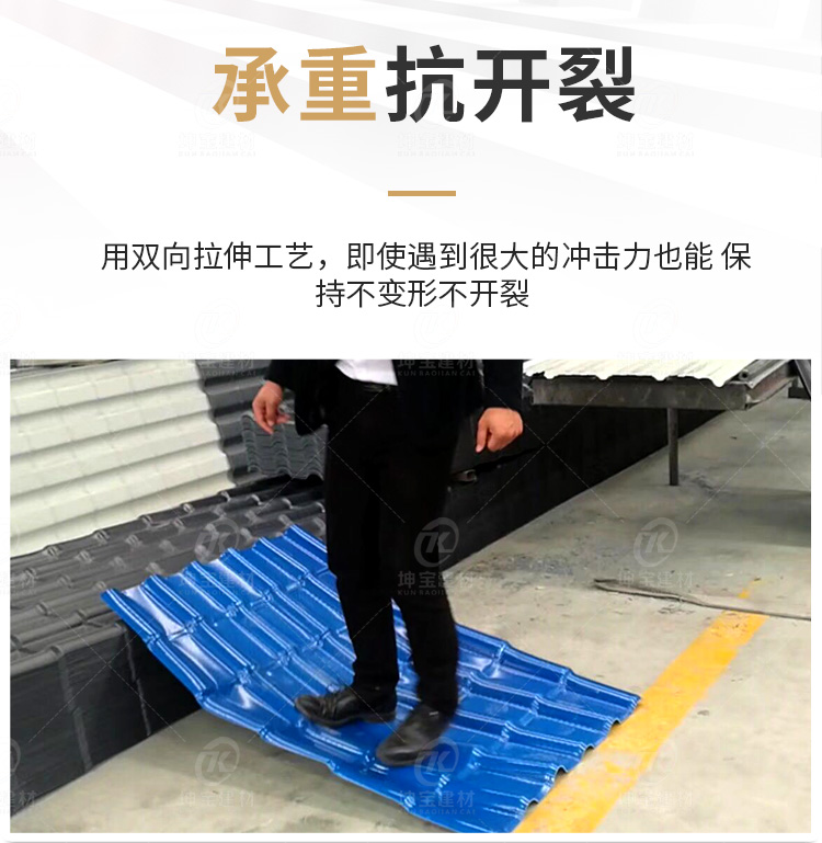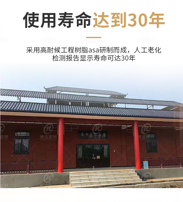 合成樹脂瓦在總結國內(nèi)外同類產(chǎn)品經(jīng)驗的基礎上進行了創(chuàng)新,它突出的特點是色彩豐富并經(jīng)久不褪,造型美觀立體感強且符合中國建筑文化特色。同時它還具有質(zhì)輕、防水、堅韌、保溫、隔音、防腐蝕、抗風防震、抗冰雹、抗污染、防火、絕緣、安裝簡便等優(yōu)點,是各類建筑表面裝飾和防水的理想材料平改坡工程。