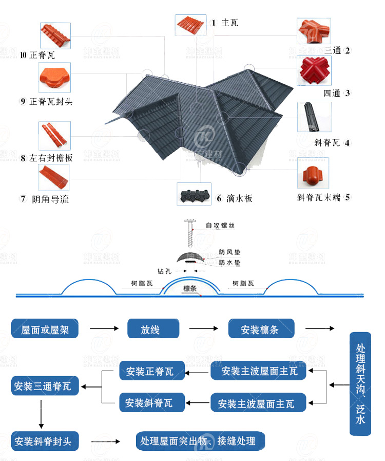 合成樹脂瓦安裝方便快速,主瓦安裝時要根據當時風向逆向安裝,搭接一個瓦坡,兩側同時進行以保證能對齊。安裝正脊瓦時將**張脊瓦截掉一段后再安裝。